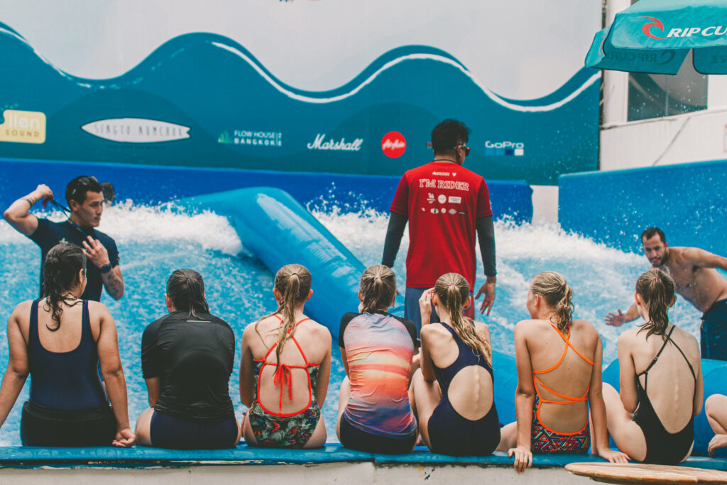 Flow House Bangkok is an indoor artificial surfing venue located in the heart of Bangkok on Sukhumvit 26, offering a real surf experience without needing to go to the beach.